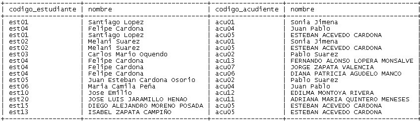 select estudiantes.codigo_estudiante,estudiantes.nombre,acudientes.codigo_acudiente,acudientes.nombre from estudiantes inner join estudiante_acudiente on estudiantes.codigo_estudiante=estudiante_acudiente.codigo_estudiante inner join acudientes on estudiante_acudiente.codigo_acudiente=acudientes.codigo_acudiente;