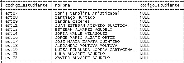 select estudiantes.codigo_estudiante,estudiantes.nombre,acudientes.codigo_acudiente from estudiantes left join estudiante_acudiente on estudiantes.codigo_estudiante=estudiante_acudiente.codigo_estudiante left join acudientes on estudiante_acudiente.codigo_acudiente=acudientes.codigo_acudiente where estudiante_acudiente.codigo_acudiente is null;