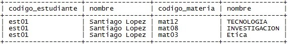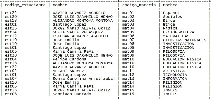 select estudiantes.codigo_estudiante,estudiantes.nombre, materias.codigo_materia,materias.nombre from estudiantes inner join materia_estudiante on estudiantes.codigo_estudiante=materia_estudiante.codigo_estudiante inner join materias on materia_estudiante.codigo_materia=materias.codigo_materia;