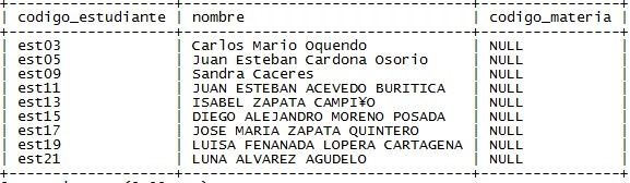 select estudiantes.codigo_estudiante,estudiantes.nombre, materia_estudiante.codigo_materia from estudiantes left join materia_estudiante on estudiantes.codigo_estudiante=materia_estudiante.codigo_estudiante where materia_estudiante.codigo_estudiante is null;